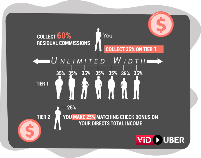 Get paid 35% direct commissions and 25% Matching check commissions on your directs for a total payout of 60%